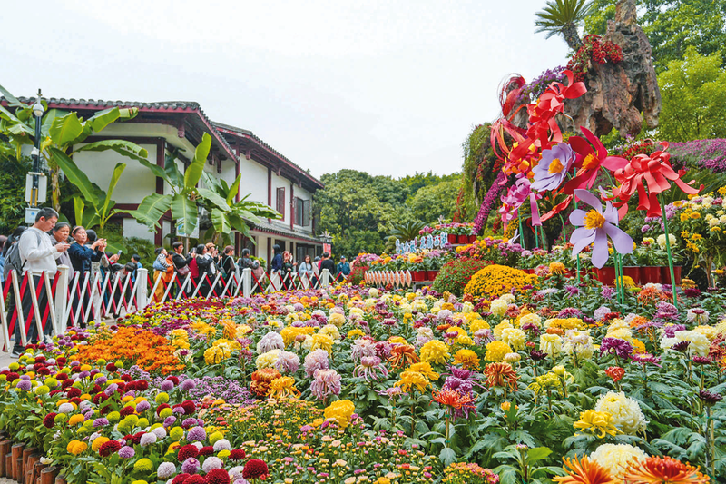 园内特别展出荣获中国菊花展大奖的作品《三山雨中游西湖》,以辛弃疾诗词为灵感,打造烟雨朦胧的沉浸式景观,宛在堂前菊丛曲径通幽,东姐妹亭融合诗词与建筑美学,菊花园汇聚千余品种与竹屋小桥共绘田园画卷。菊展巧妙融合自然美与艺术美,让游客在“一步入菊境满目皆秋韵”中感受东方美学意趣。(林君/文包华/图)