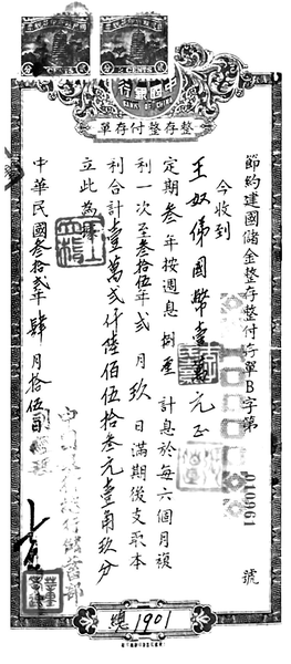 抗日战争时期,新加坡也深受战火波及。1943年,中国抗战进入关键阶段,国民政府号召海外华侨以存款形式支持祖国抗战。彼时,新加坡已被日军占领。王奴俤虽在异乡,却心怀祖国,他冒着风险,将多年积蓄的1万元国币以“节约建国储金”三年定期、通信存款的方式汇往纽约中国银行。