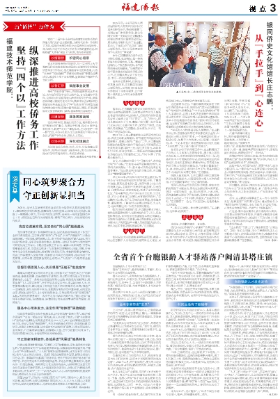 党的二十届四中全会对推进国家治理体系和治理能力现代化作出全面部署,为新时代侨务工作指明了方向。福建技术师范学院立足福清侨乡地缘优势,深入践行习近平总书记关于侨务工作的重要论述,积极构建“大侨务”观念工作机制,取得系列成效。
