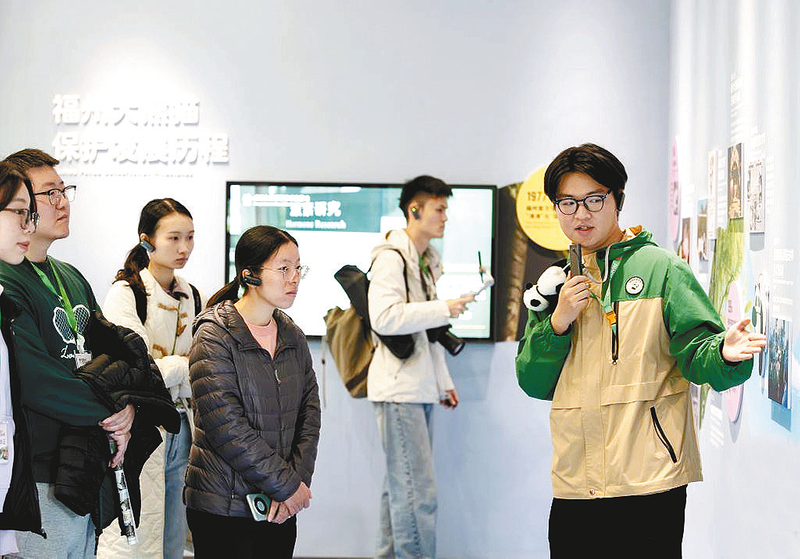 近日,福州熊猫世界的工作人员向游客介绍福州大熊猫保护发展历程。 图片来源:新华社 “ 晶亮”“艾伦”“荣耀”“启程”“启航”,5只大熊猫1月17日与公众见面,福州熊猫世界又恢复了往日的热闹。