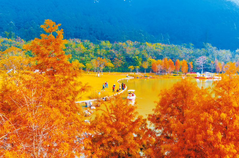 在漳州市长泰区,限定的治愈色系已就位,连片落羽杉正换上“盛装”,红的热烈、黄的璀璨、绿的清新,层林尽染间满是冬日的温柔。 (肖国和/图)