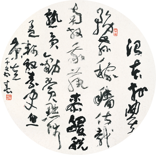草书:节录千字文句 一条条蕴藏细微生活的长河在生活之底淋漓成归心的情愫;如音符般曼妙的线之舞载着你的欢乐,你的痛苦,你的执著,在那里有彷徨,有困惑,有焦虑。灵动的点线,有时候似水,流进内心的江河,以睡的形态醒着;有时候像雨,融入土层,以垂直的姿势横着。