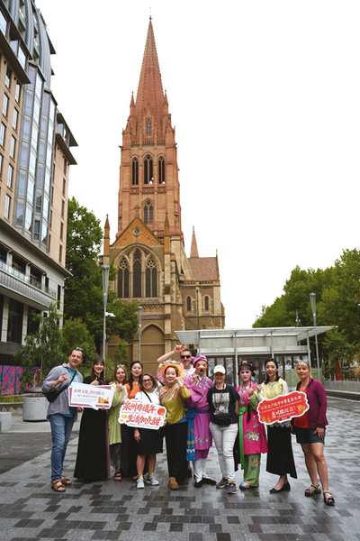 黄丽泳(左六)随泉州文旅推介团队到澳大利亚推广非遗。(泉州市文旅局供图) “ 把中国式美学和泉州蟳埔文化带到国外,是最让人骄傲和自信的事。”日前,刚从澳大利亚回国不久的黄丽泳告诉记者,她的目标是将簪花围带向更广阔的世界舞台,让“行走的花园”成为全球时尚。